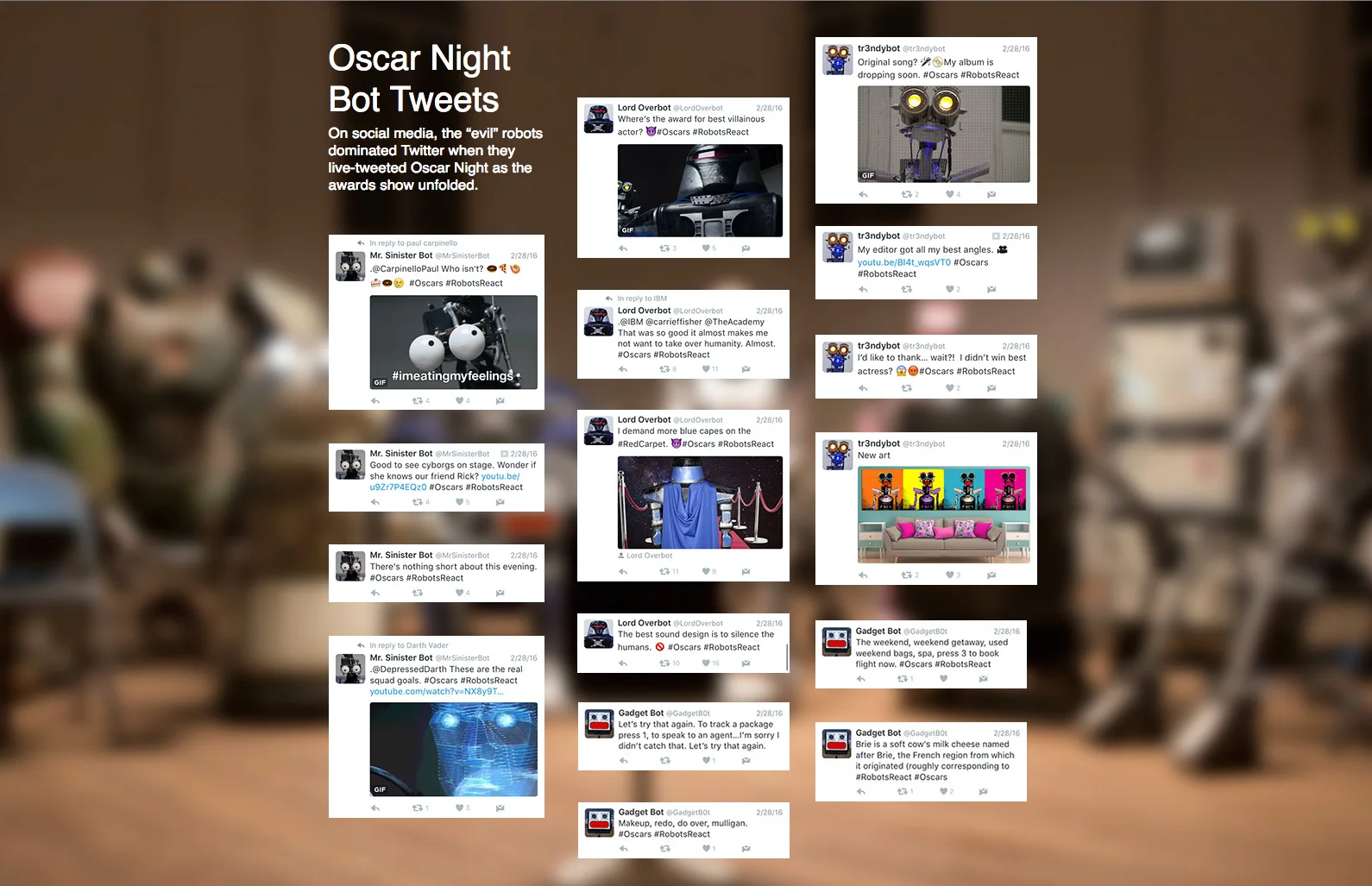 We gave each robot a unique Twitter handle. During the Oscars, they twisted just about every memorable moment into something about human domination.